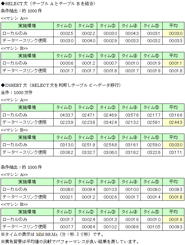 本検証と同様に簡単なクエリであっても5分以上の差が発生したり、結果が返らないほど悪化したという報告ケースもある中、この結果となったことにはテーブル構成やデータ、INSERT文(条件抽出)実行時のようにハード、ネットワークの影響等も大きく、必ずしもデータベースリンクを利用してもパフォーマンスが悪くなるということが無いと言えるのではないでしょうか。
