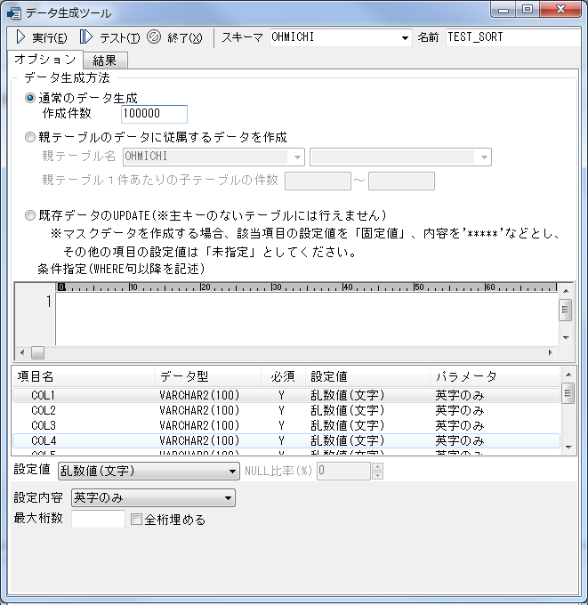 各項目には連番やランダムな値、住所・氏名電話番号等あらかじめ用意されたテンプレートから選択することも可能です。今回の検証ではCOL1~COL10に乱数値(文字)を選択しました。