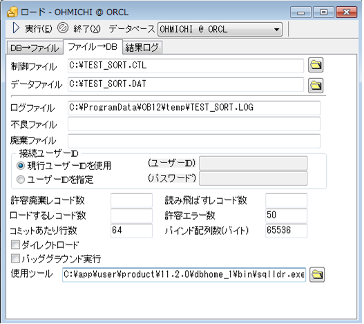 「ファイル→DB」タブでは、指定したファイルをSQL*Loaderを使用してテーブルに挿入します。今回は同じくロード機能で出力したファイルの内容を修正しながら(データに種類を変えながら)、テーブルに挿入します。