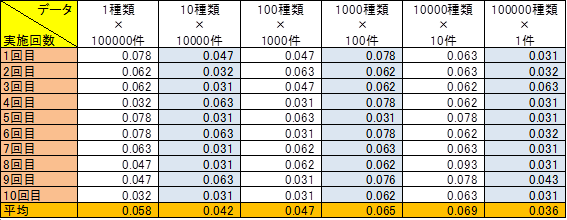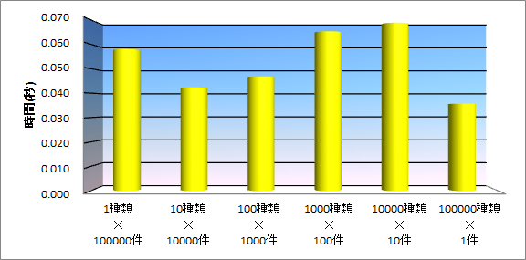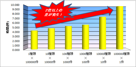 「1種類」データと、「100000種類」データの実行時間の差は2倍以上となりました。