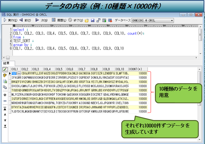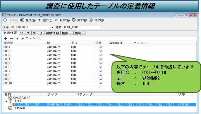 | テーブル項目 | COL1,COL2・・・COL10 (データ型:VARCHAR2型, 長さ:100) ※主キー設定なし |