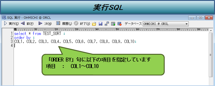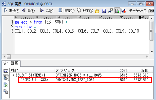 なお、ソート句に指定した項目をすべて含むインデックスを作成しているため、SQL実行時にインデックスが使用され、実行時間は大幅に改善されています。