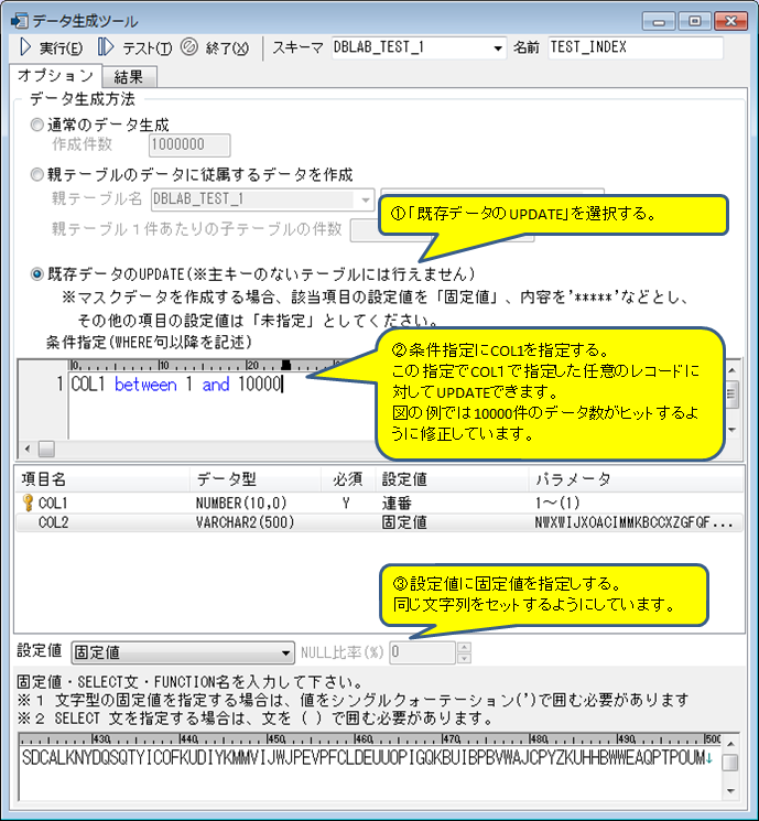 図2では10000件のデータを用意するため、「既存データのUPDATE」を使用しているところです。