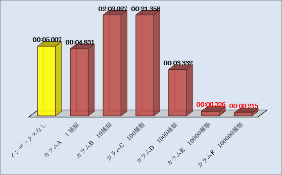 | カラムC 100種類 | 00:03.075 | 00:04.013 | 00:03.277 | 00:03.133 | 00:03.162 | 00:21.358 △-326.56% |