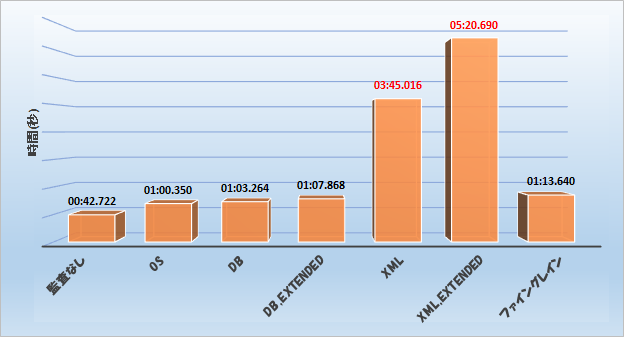 また、ファイングレイン監査以外の監査方法に関しては、「監査なし」との差がほとんど見られず、「標準監査(xml)」「標準監査(xml,extended)」の実行時間に関しては、実行回数を減少させた影響か、時間の短縮が見られました。