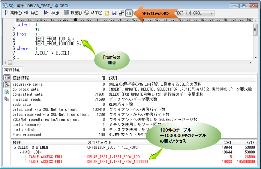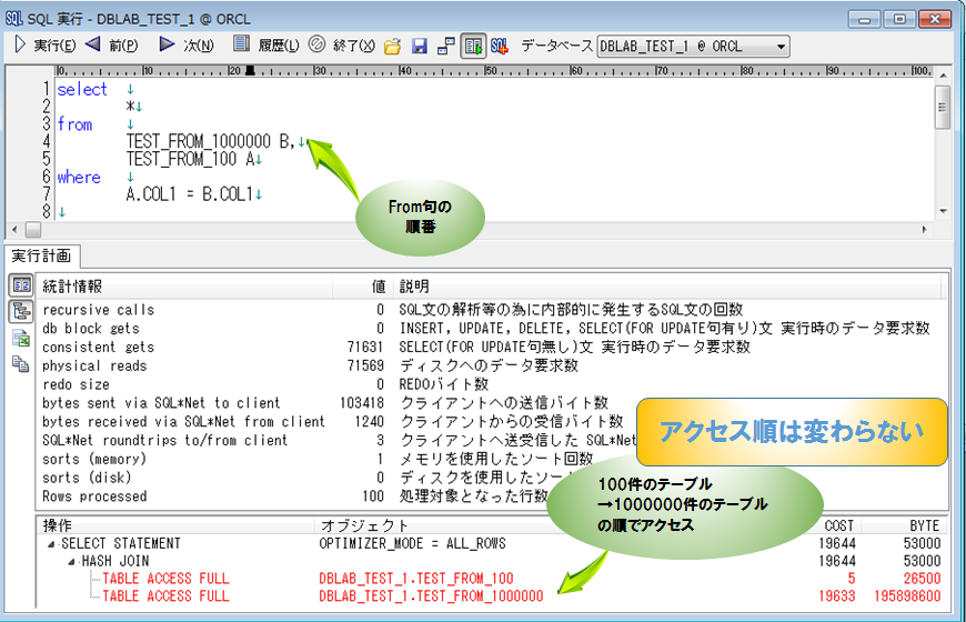 実行SQLの準備ですが、前述したようにCBOでは自動的に最適なアクセスパスを判断するため、from句の順番を変えても実行計画が変わらず、パフォーマンスに影響し辛くなっています。