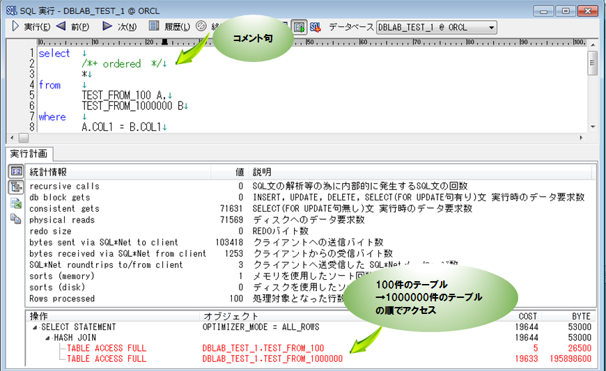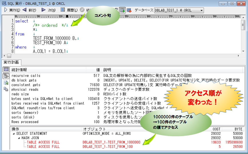 上記の通りfrom句の順番を変えても変化はありませんので、今回の検証ではオプティマイザ・ヒントを付けてfrom句の順番でアクセスする順番が変わるようにしました。